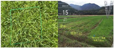 1.4 試驗設(shè)計:試驗設(shè)每畝愛秀100ml、150 ml,愛秀·氯氟吡氧乙酸混劑160 ml、145 ml、130 ml,愛秀100 ml+氯氟吡氧乙酸60 ml,驃馬100 ml+氯氟吡氧乙酸60 ml兌水30L電動噴霧器噴霧;愛秀·氯氟吡氧乙酸160 ml,愛秀100 ml+氯氟吡氧乙酸60 ml,驃馬100 ml+氯氟吡氧乙酸60 ml兌水1.2L無人機飛防,以及清水空白對照11個處理。前8個噴霧處理(含CK),小區(qū)面積300㎡,后3個飛防處理,每處理面積6-10畝。噴藥時間為2022年12月20日,麥苗生育期為3-4葉期。